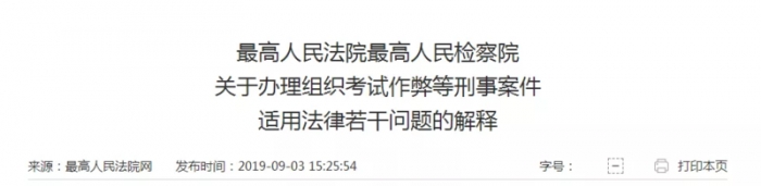 9月3日,最高人民法院、最高人民檢察院聯(lián)合發(fā)布《關(guān)于辦理組織考試作弊等刑事案件適用法律若干問題的解釋》。