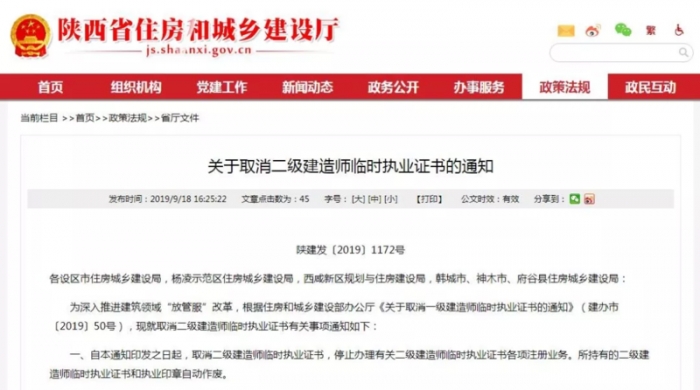 陜西省住房和城鄉(xiāng)建設(shè)廳關(guān)于取消二級(jí)建造師臨時(shí)執(zhí)業(yè)證書(shū)的通知