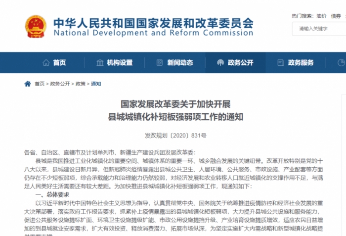6月3日,國家發(fā)展改革委下發(fā)《關(guān)于加快開展縣城城鎮(zhèn)化補短板強弱項工作的通知》,強調(diào),開展縣城城鎮(zhèn)化補短板強弱項工作,要聚力推進(jìn)17項建設(shè)任務(wù)。圍繞環(huán)境衛(wèi)生設(shè)施提級擴能,完善垃圾無害化資源化處理設(shè)施、污水集中處理設(shè)施和縣城公共廁所;圍繞市政公用設(shè)施提擋升級,推進(jìn)市政交通設(shè)施、市政管網(wǎng)設(shè)施、配送投遞設(shè)施、老舊小區(qū)更新改造和縣城智慧化改造。