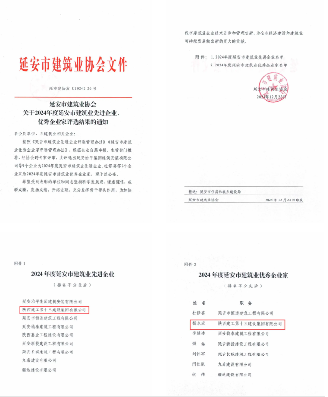 日前,延安市建筑業(yè)協(xié)會公布了2024年度延安市建筑業(yè)先進企業(yè)、優(yōu)秀企業(yè)家、項目經理部、項目經理、項目總工評選結果,陜西建工第十三建設集團有限公司被評為2024年度延安市建筑業(yè)先進企業(yè);集團黨委副書記、總經理楊永宏同志被評為優(yōu)秀企業(yè)家;師范路綜合整治項目部被評為建設工程優(yōu)秀項目部;雷慧東、上官松、拓振華、袁江、喬戰(zhàn)峰五名同志被評為優(yōu)秀項目經理;汪洋、王海紅兩名同志被評為優(yōu)秀項目總工。